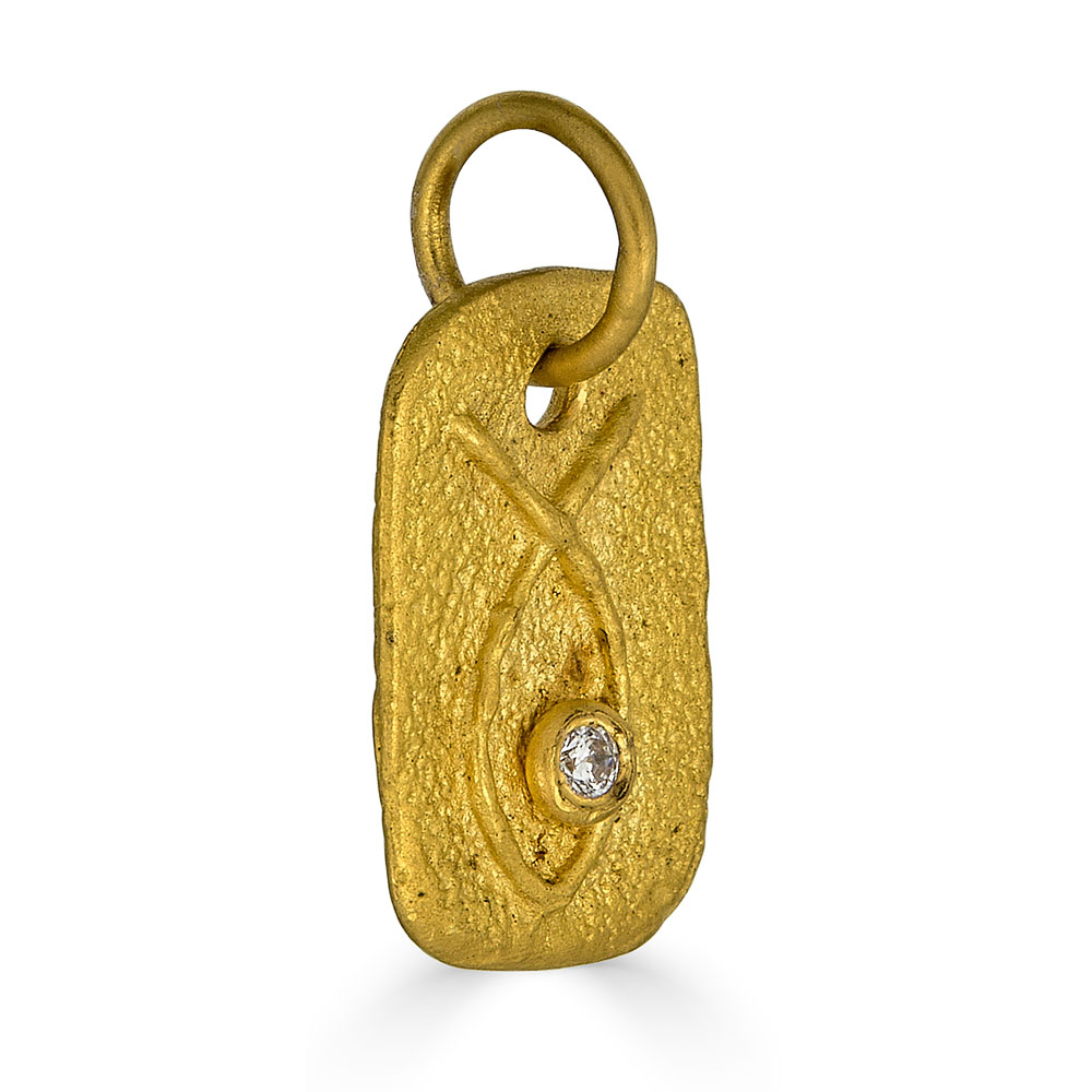 Evoking the flow of nature and the brilliance of light, this 24k Gold Rectangular Pendant captures artistry in motion. Handcrafted in pure gold, the pendant features a finely engraved fish motif, its eye marked by a single diamond a luminous detail that brings the design to life, symbolizing vision, intuition, and clarity.